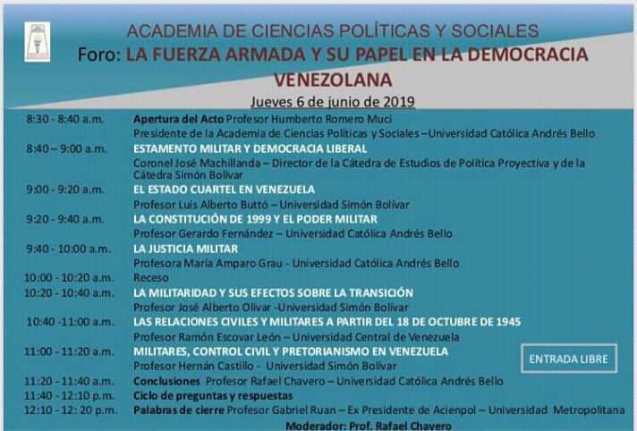 El jueves 6 de junio se realizará el foro La Fuerza Armada y su papel en la democracia venezolana, desde las 8:30 de la mañana, en la Academia de Ciencias Políticas y Sociales, Palacio de las Academias.