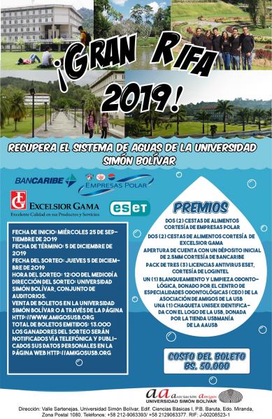 La Asociación de Amigos anuncia que ya están a la venta los boletos de la Gran Rifa 2019, cuyos dividendos serán destinados a la Recuperación del Sistema de Aguas de la Universidad Simón Bolívar.